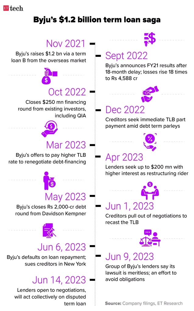 - On June 5, BYJU’S failed to make its quarterly interest payment of $40 million, triggering a legal dispute with creditors and resulting in a lawsuit against Redwood, one of its lenders.